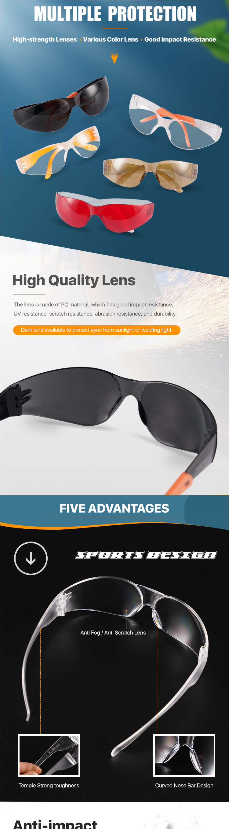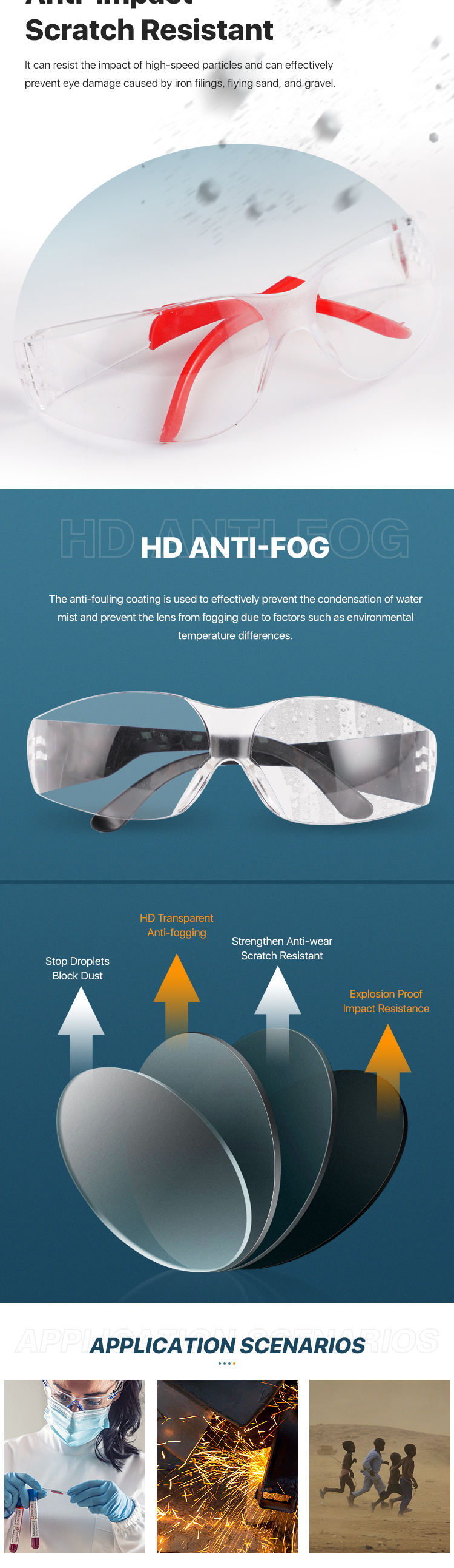 Anti-impact/Anti-fog/Anti-scratch/Splash resistant
