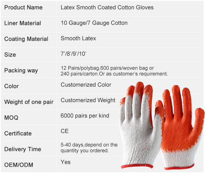 • Top Sale Orange Latex Smooth Coated Cotton Gloves